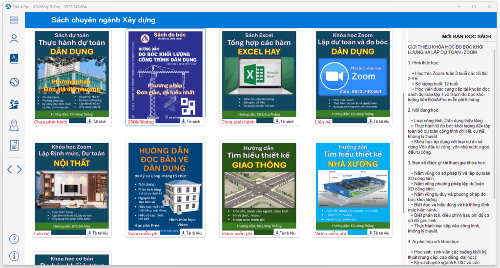 + Tài khoản đọc sách dự toán và đo bóc KL trực tuyến trên App EduAiProPhần mềm